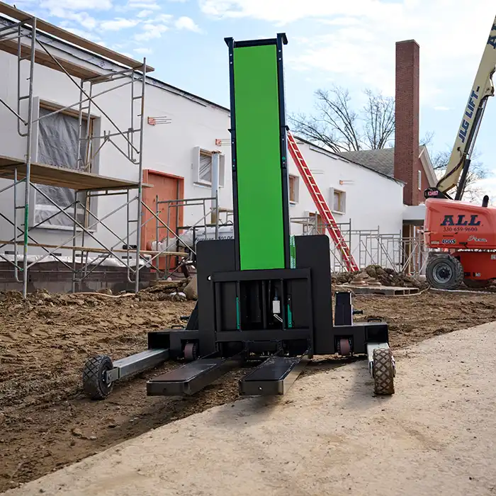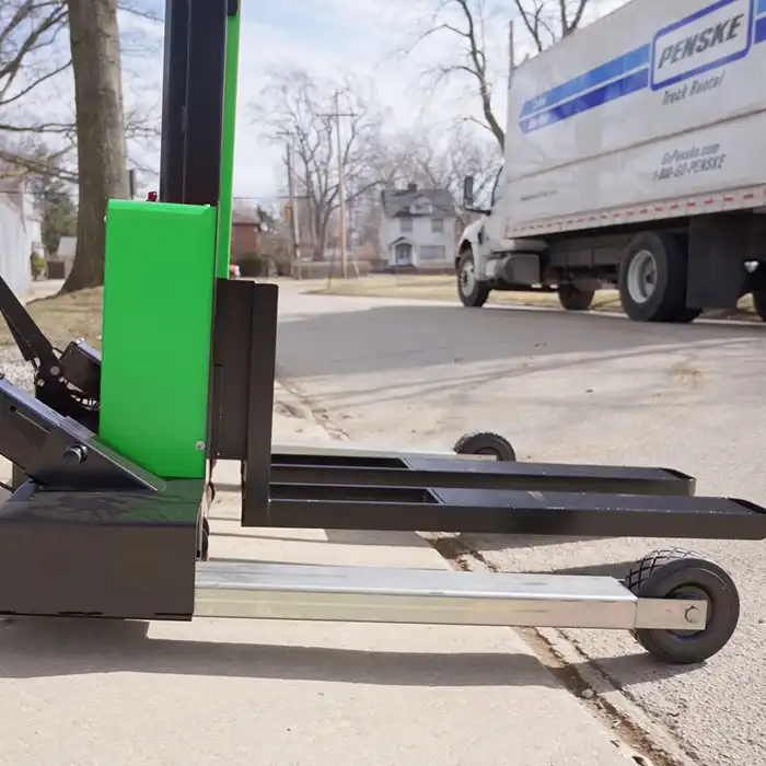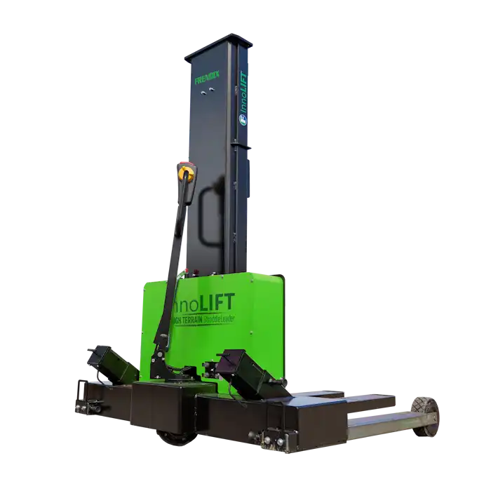 The ERT1000.1500 is a straddle model designed for rough terrain use. Compatible with all 1000kg Innolift models including self-propelled. It is the ONLY Rough Terrain Stacker that lifts pallets and ITSELF in & out of delivery trucks.Designed for surfaces like rough asphalt, thresholds, and hard mud. Powerful drive motor and remote control make the operation easier and lighter.