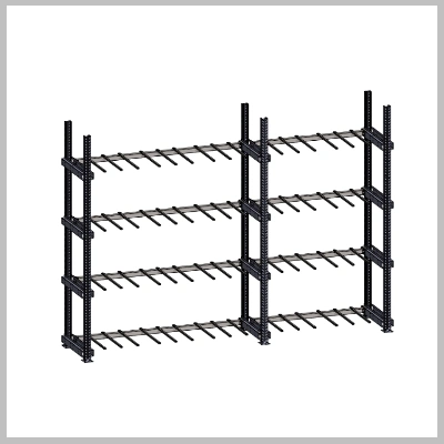Frendixin kiinteät rengashyllyt koostuvat pylväselementeistä ja vaakatasoista. Renkaat säilytetään vaakatasossa.
